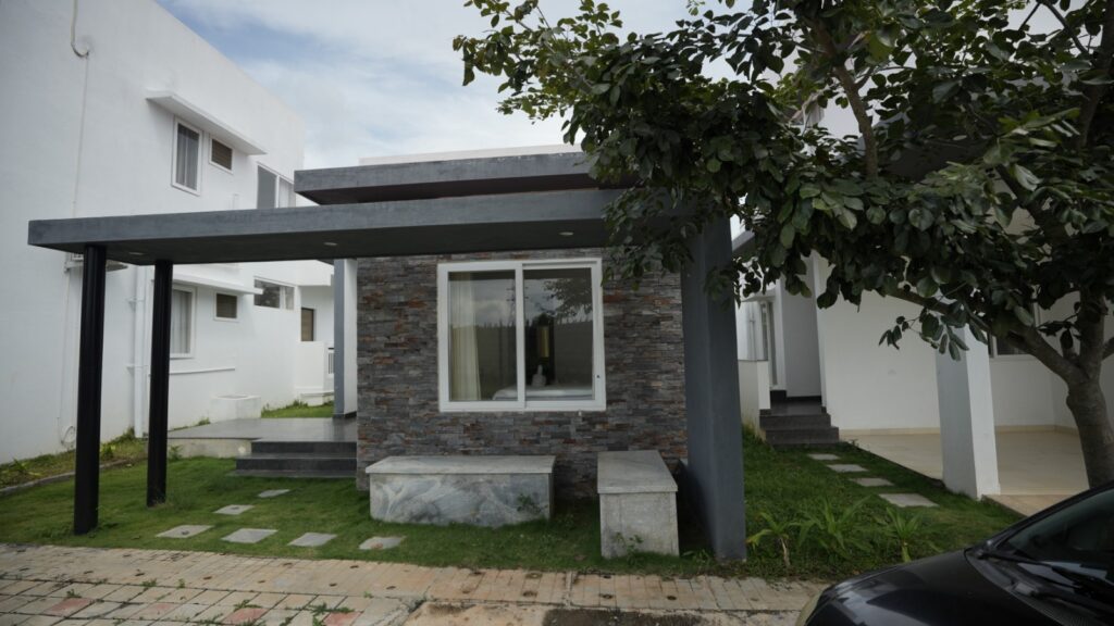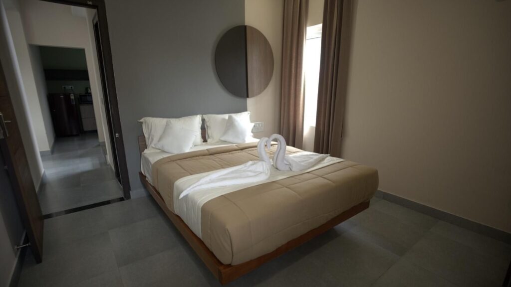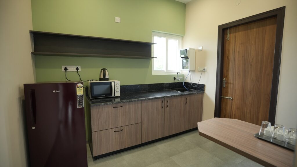 Guests can stay in luxurious, fully furnished villas (1BHK, 2BHK & 3BHK), each equipped with AC, modern electronics, and a serene view of Nandi Hills.